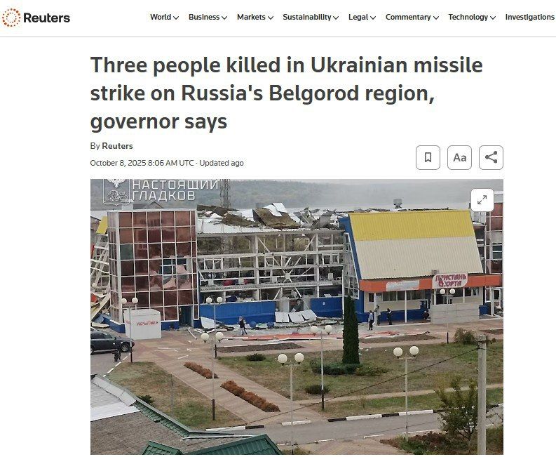 , - губернатор Гладков.Напомним, три мирных жителя погибли в результате ракетного удара укронацистов по Белгородской области.Ещё три человека погибли в Херсонской области — при обстреле укронацистами посёлка...